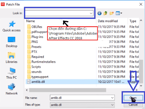 C:\Program Files\Adobe\Adobe After Effects CC 2018, chọn tệp amtlib.dll, nhấn Open