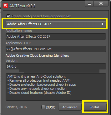 Bước 4: Tải công cụ kích hoạt, sau đó mở tệp amtemu.v0.9.2-painter.exe. Tại giao diện chính, chọn mục Adobe After Effects CC 2017, sau đó nhấn Install