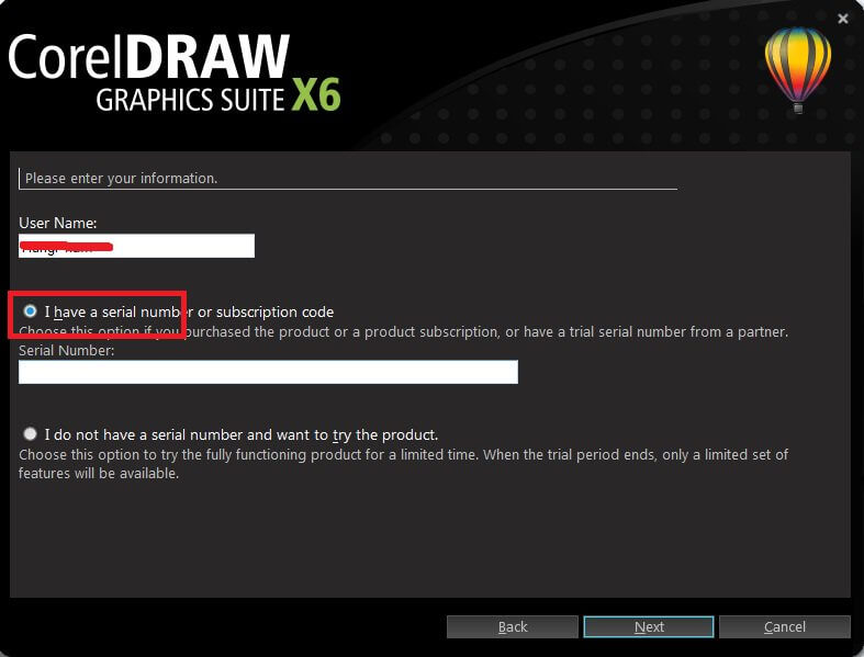 Bước 4: Đánh dấu chọn vào mục “I have serial number or subscription code”.