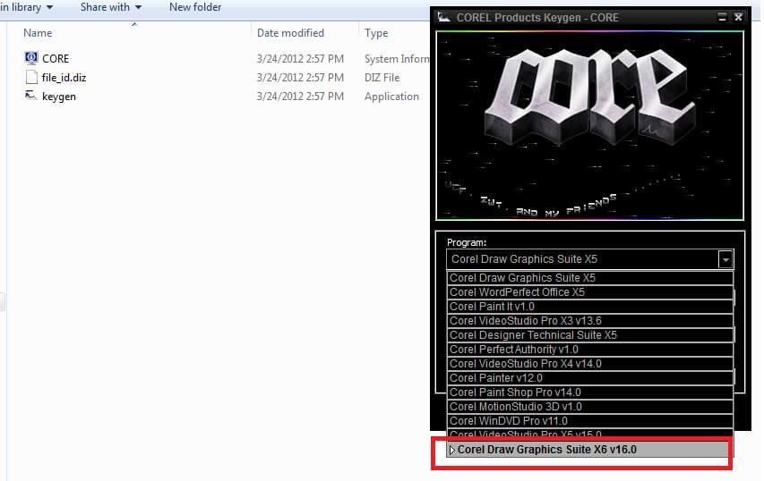 Bước 6: Trong giao diện keygen, tại ô “Program“, hãy chọn đúng phiên bản CorelDRAW X6.
